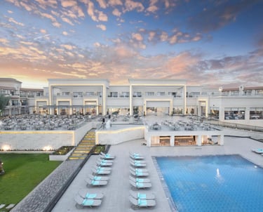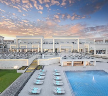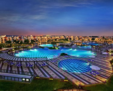 صف اول من البحر ... يحتوي علي شاطئ رملي ... 5 نجوم ديلوكس ... يقع في مكادي باي...اكوا بارك عملاقه ...حفلات ترفيهيه